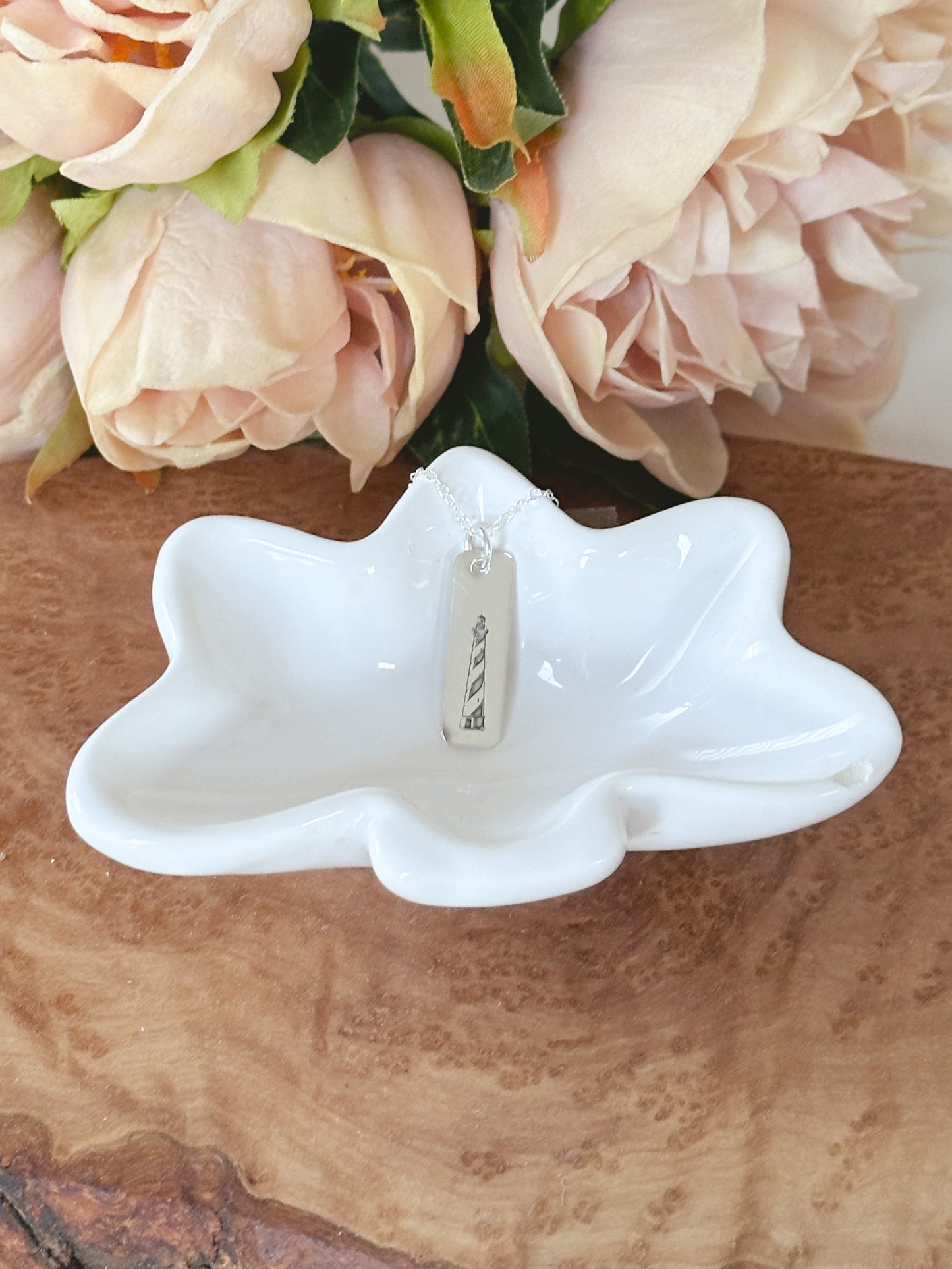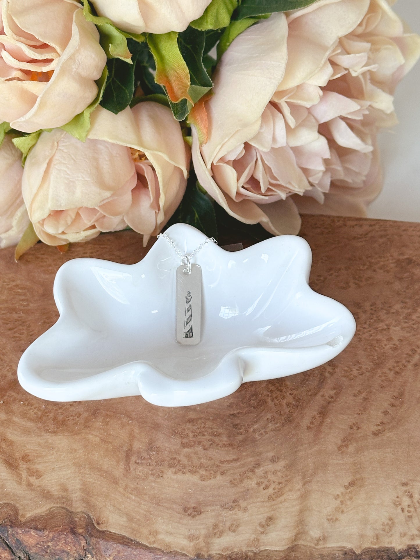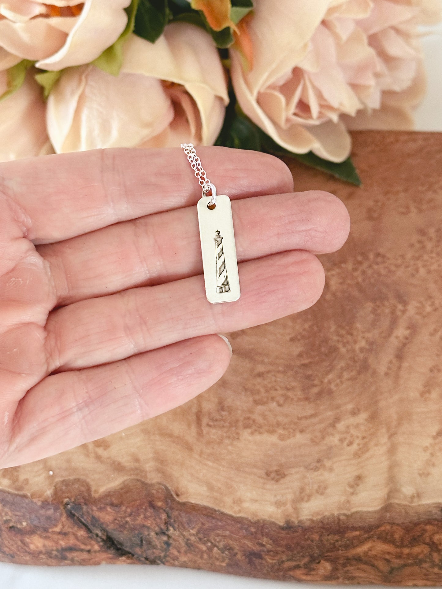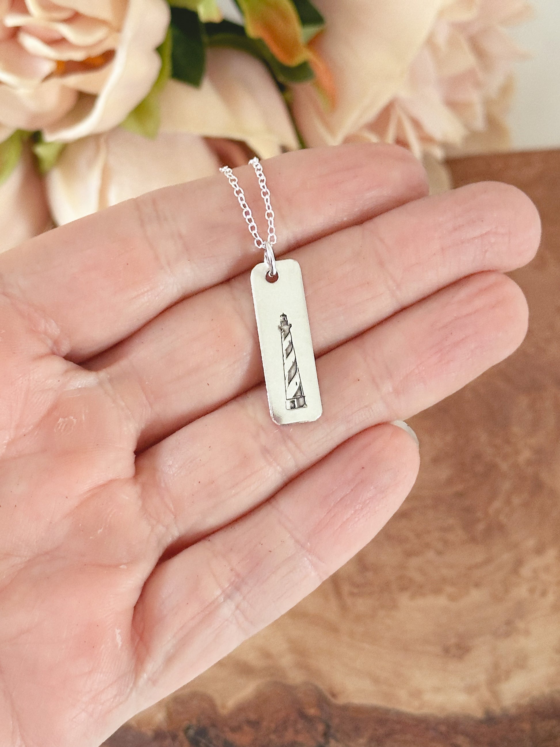 Capture the breathtaking beauty and charm of the Outer Banks with this handcrafted necklace. Our sterling silver rectangle tag features a custom engraved image of the iconic Cape Hatteras lighthouse, a must-see landmark in North Carolina. With a polished finish, this necklace is a perfect way to commemorate your favorite vacation spot or bring the beach to your everyday look.