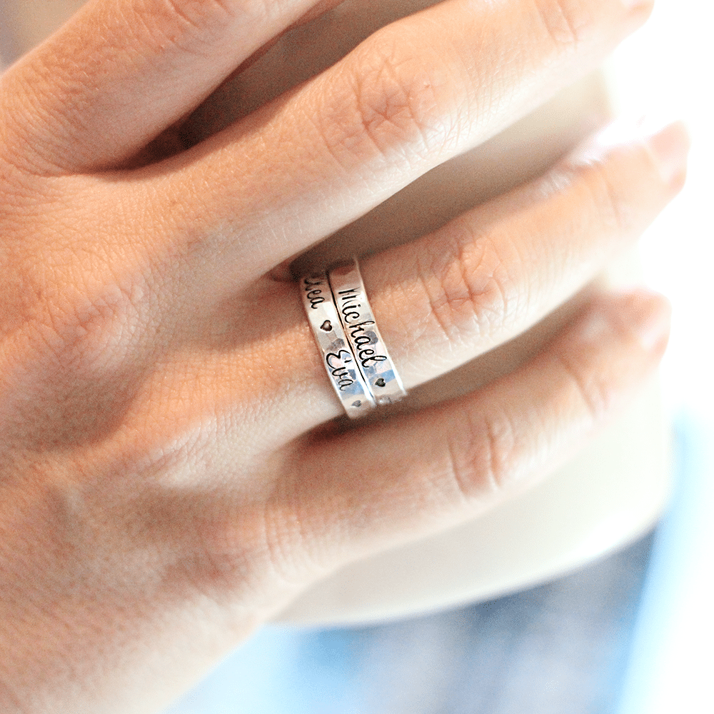 Each sterling silver band is given a hammered texture and hand stamped with names of your choice