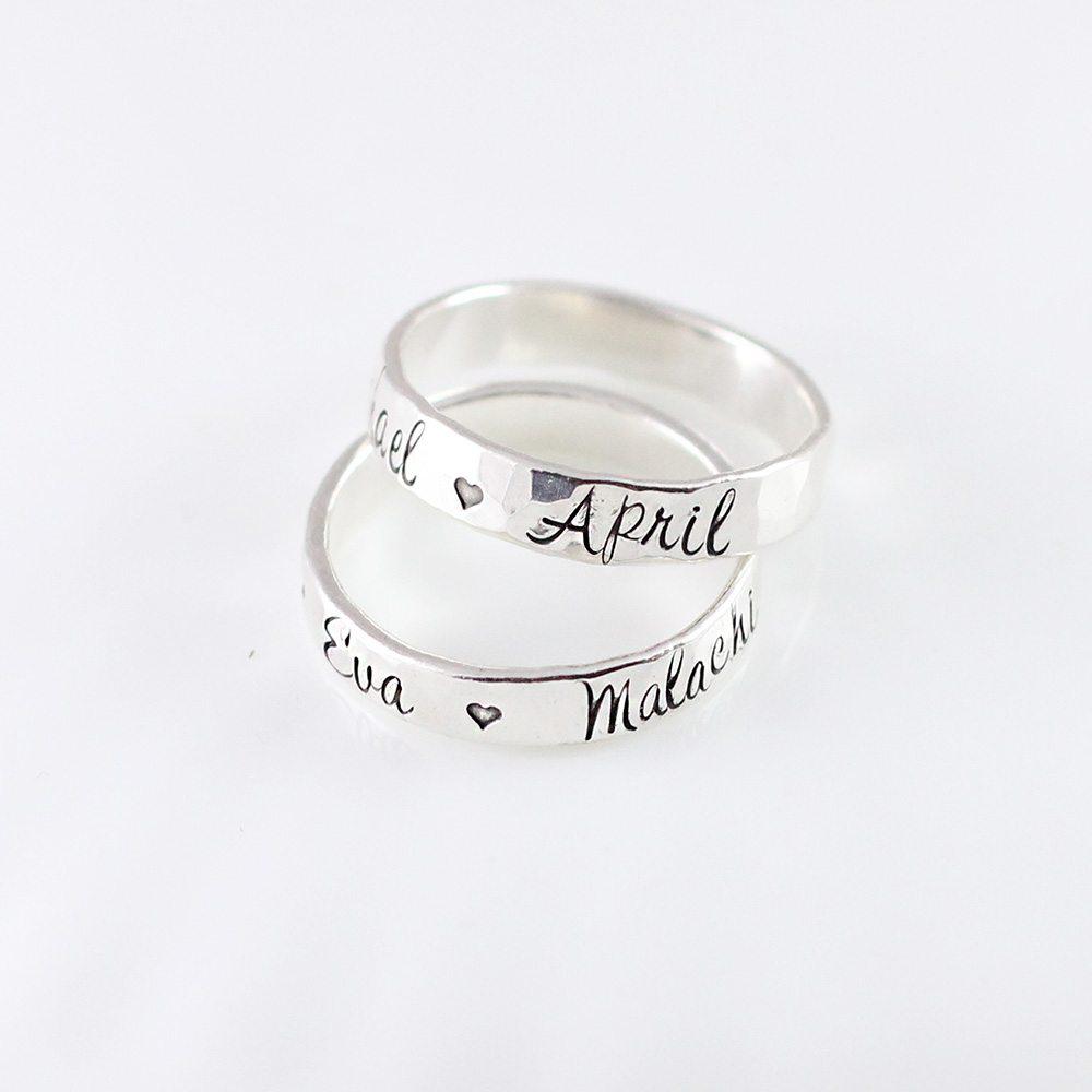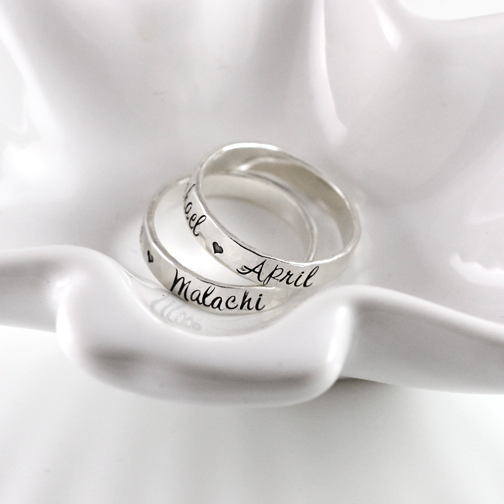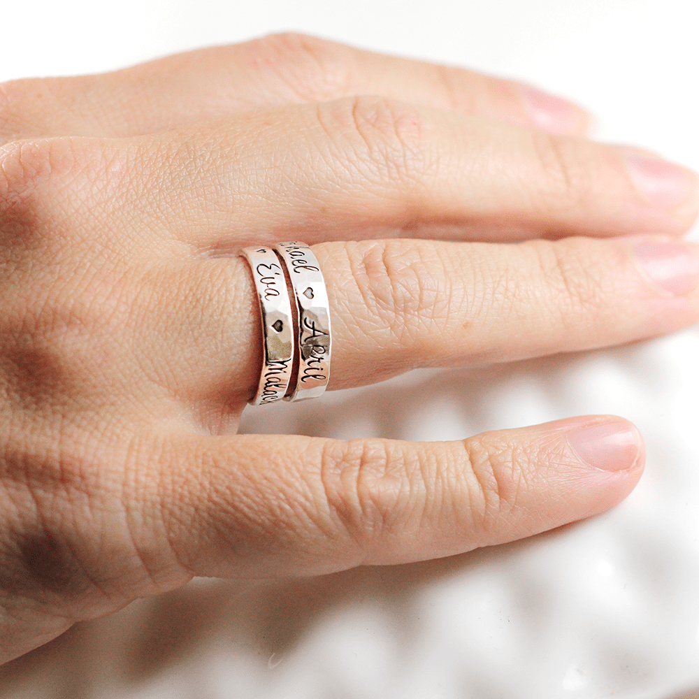 Every mother wants to hold her loved ones close. What better way than with these gorgeous hammered stacked name rings.