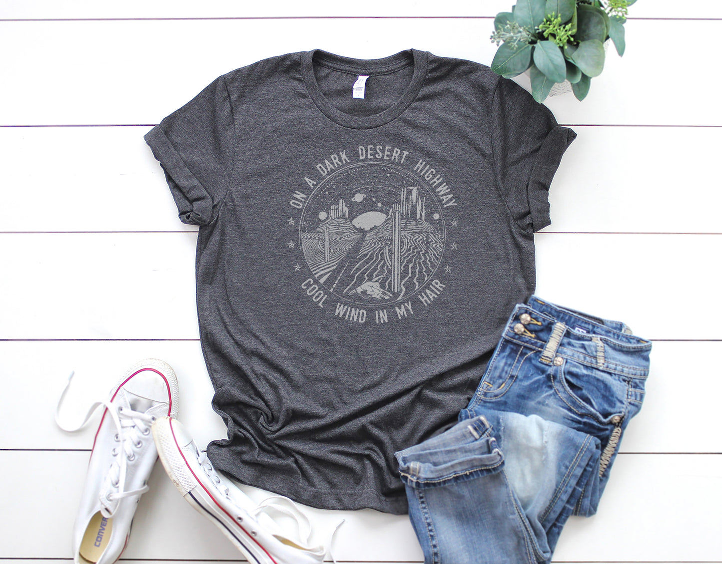 Have your favorite song running through your head all day long with this On a Dark Desert Highway shirt. For any Eagles fan or adventure seeker!