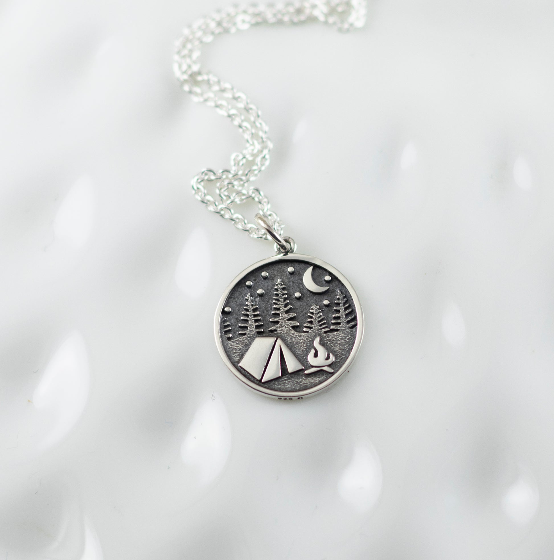Sterling silver embossed camping scene necklace (measures approximately 5/8") on sterling silver 18" cable chain