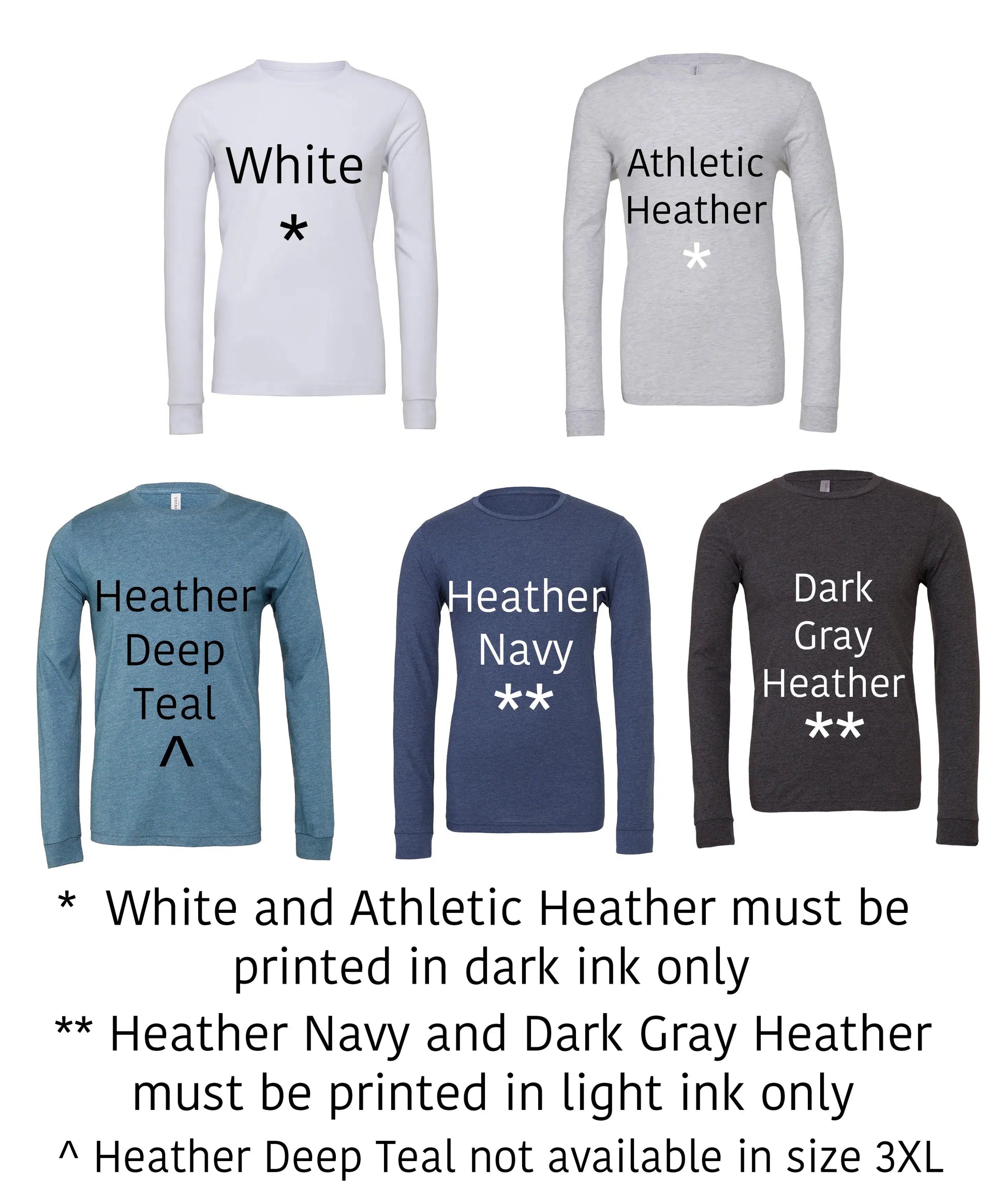 Shirt shown printed on Comfort Colors long sleeve in blue spruce (main photo). Also shown with charcoal ink option on Bella Canvas athletic heather tee and Gildan sand crewneck.